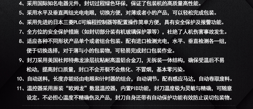 6.溫控器采用原裝“歐姆龍”數(shù)顯溫控器,內(nèi)置PID功能,封刀溫度極為靈敏與精確,可隨意設(shè)定。不必?fù)?dān)心溫度不精確傷及產(chǎn)品,封刀自身還帶有自動保護(hù)功能,有效防止誤切包裝物。