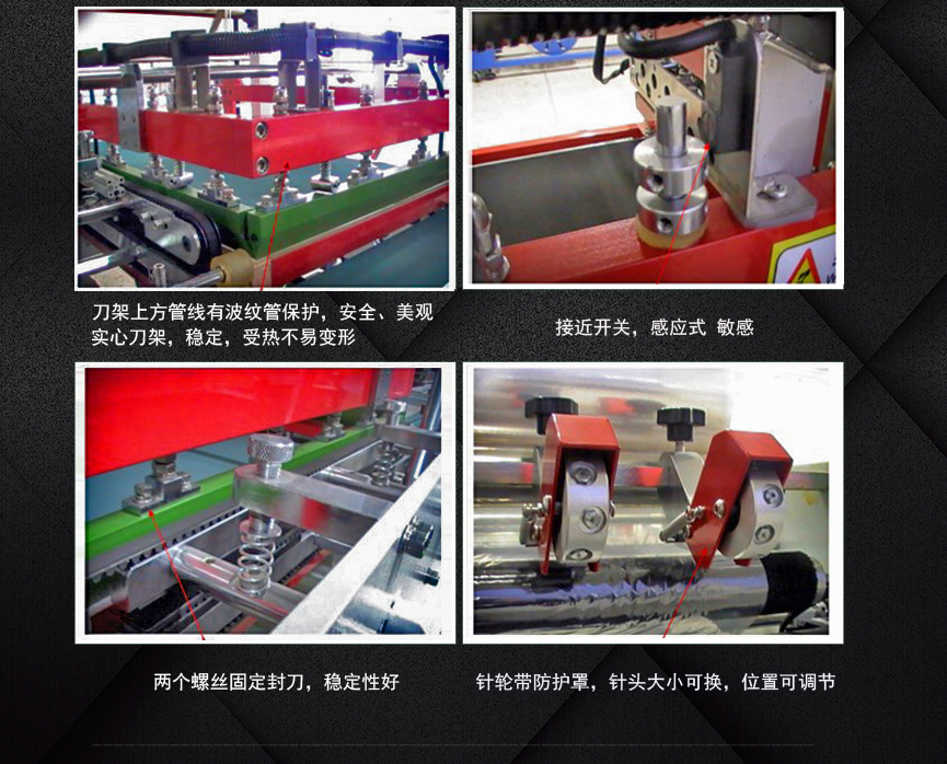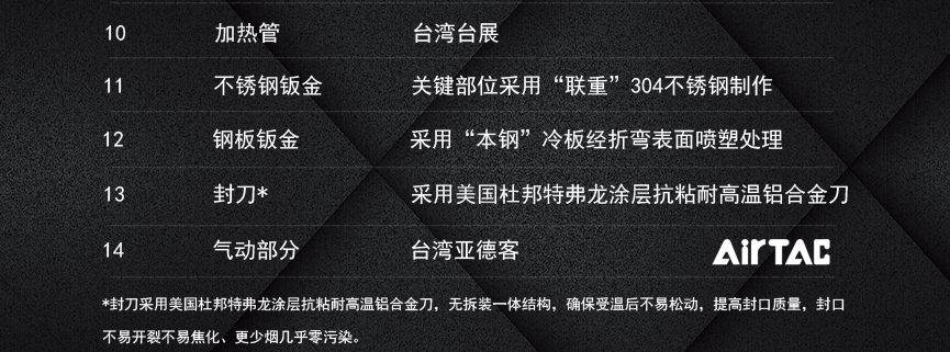 1.封刀采用美國杜邦特弗龍涂層抗粘耐高溫鋁合金刀,無拆裝一體結(jié)構(gòu),確保受溫后不易松動,提高封口質(zhì)量,封口不會開裂,不會焦化、不冒煙零污染。